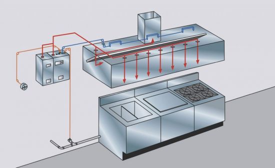 The R-102 Overlapping “suppression zone" coverage system is designed to protect cooking equipment such as various types of fryers, griddles, range tops, broilers, char-broilers and woks. It also detects and suppresses fire in ventilating equipment including hoods, ducts, plenums and auxiliary grease extraction devices.