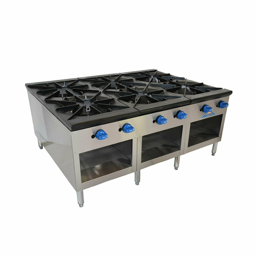 Stock Pot Range, Gas, 54" wide, (6) double ring venturi, cast iron burners, (12) total manual controls, open front cabinet base, cast iron top grates, stainless steel exterior finish, 540,000 - 660,000 BTU, (3) 3/4" gas connections, NSF, Made in USA| Brand | Comstock Castle |