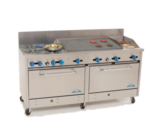 Range, gas, 72" wide, (4) Four star burners (Front burner 24,000 BTU) (Rear burner 30,000 BTU) with 12" square cast iron grates, (1) 18" - 3/4" thick griddle with manual controls, (1) 30" char-broiler, angle iron radiants, (2) extra wide 31" ovens with enamel bottom & door lining, (1) rack per oven, (3) rack positions, stainless steel exterior & 7" backguard, 6" stainless steel legs, welded frame, 2" clearance rating, 284,000 BTU, 3/4" rear Gas Connection, NSF, cETLus| Brand | Comstock Castle |