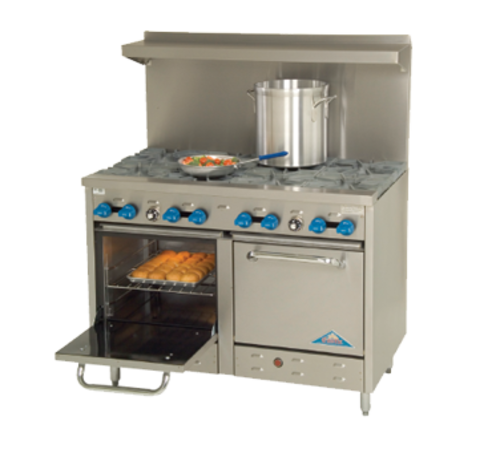 Range, gas, 48" wide, (8) Eight star burners (Front burner 24,000 BTU) (Rear burner 30,000 BTU) with 12" square cast iron grates, (2) space-saver ovens with enamel door & bottom linings, (1) rack per oven with 3 positions, stainless steel exterior, with high shelf, 6" stainless steel legs, 37" tall to cook surface, ¾" gas connection, 264,000 BTU, NSF, cETLus| Brand | Comstock Castle |