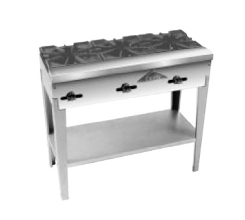 Hotplate, floor model, gas, 36" wide x 16" overall frame, (3) 24,000 BTU star burners, (3) 12" x 12" cast iron grates, stainless steel exterior & open leg base with undershelf, (3) manual controls, 72,000 BTU, 3/4" gas connection, NSF, ETL