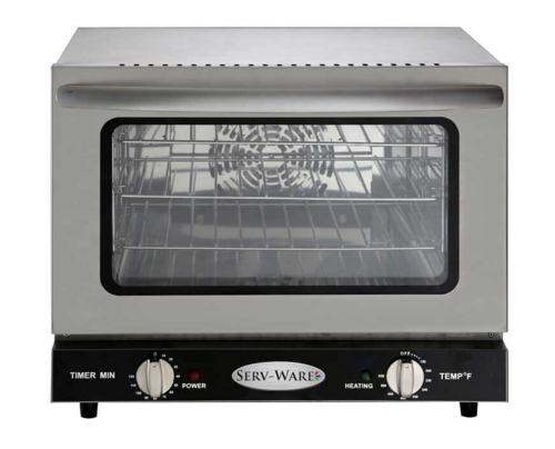 Serv-Ware - Electric Cooking - Counter Top Electric Convection Oven - Dimensions: 18.625" W x 19.25" D x 14.875" H - Temperature Range: 150°F – 500°F - Amps: 12 - Voltage: 115 - Hz: 60 - Phase: 1 - Watts: 1440 - Materials: Stainless steel interior & exterior with dual pane glass and chrome wire racks - Warranty: 1 Year, Replacement Parts Only| Brand | Serv-Ware |