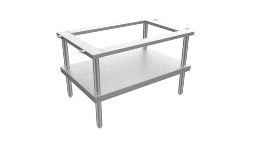 This product is an equipment stand designed for professional kitchen use. It includes an open top and an undershelf, both made from stainless steel, and features 6" adjustable legs for stability. The stand is suitable for supporting various kitchen equipment and is built to meet the demands of a commercial environment.