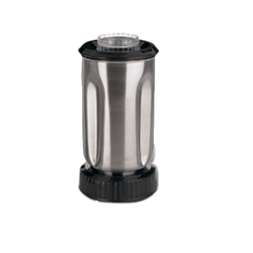 This is a blender container that includes a lid and blade. It has a 32 oz. capacity and is made of stainless steel. The container is designed for use with specific Waring Commercial blender models.