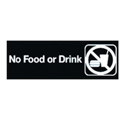 This product is a sign designed to communicate "No Food or Drink" with a white imprint on a black background. It measures 9 inches by 3 inches and is lightweight, weighing approximately 0.137 pounds. The sign is suitable for use in areas where food and drink are prohibited.