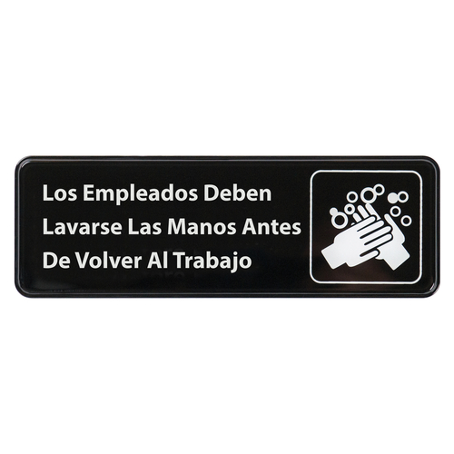 This compliance sign is designed to communicate essential information in a workplace setting. It is constructed from durable plastic and features a self-adhesive backing for easy mounting. The sign displays the message "Employees Must Wash Hands Before Returning To Work" in Spanish, with a white imprint on a black background.